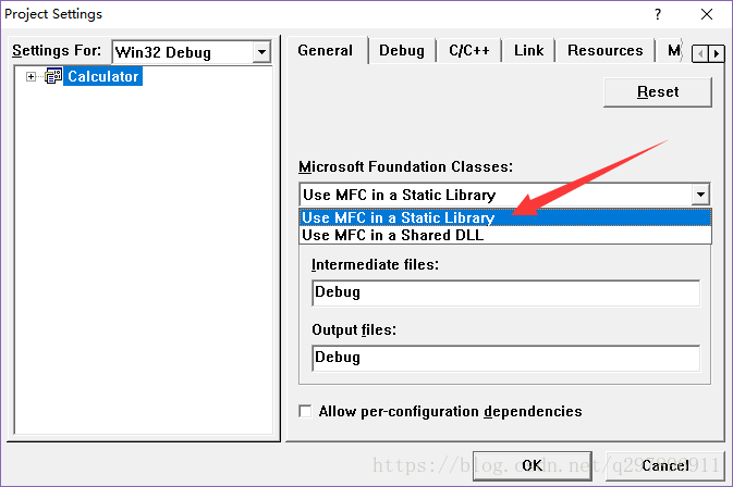 选择菜单项目 - >设置,在一般选项卡里第一项选择使用MFC在一个静态库中,静态连接,我的工程 - 设置,选择使用MFC静态链接库。