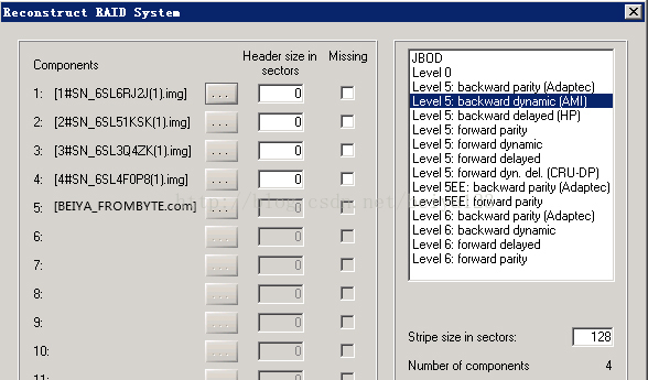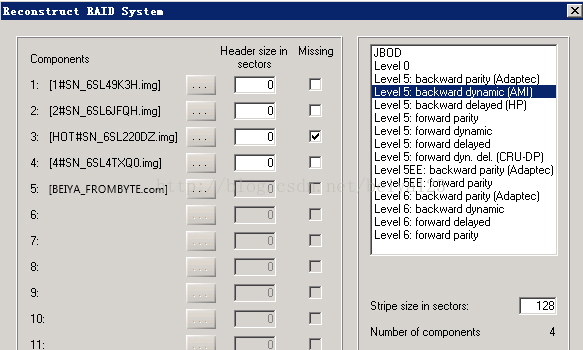 仔细分析硬盘底层数据,通过对EXT3文件系统结构进行解析,分别分析出两组raid阵列的盘序、条带大小、校验方向等配置信息,使用专业数据恢复软件winhex重组出两组raid阵列。经分析,两组raid阵列块大小都为64K,校验方向为做同步,对故障raid进行重组时注意进行缺盘处理。
