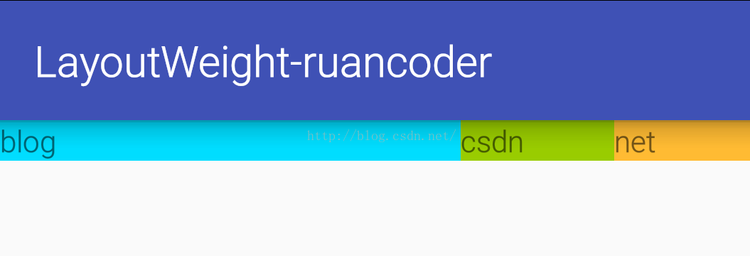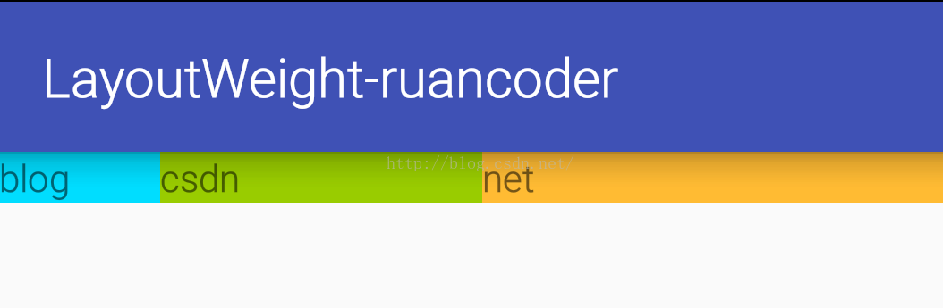 我们会发现,出现了跟我们预期截然不同的结果。那么为什么会出现这种情况呢,这时候我们再回到上面官方对weight的定义。 父视图根据子视图声明的weight值所占的比例,来为它们分配剩余的空间。也就是说,在这里LinearLayout先根据三个TextView的layout_width属性,为它们分配宽度,LinearLayout的宽度减去三个TextView的宽度,会有一个剩余宽度,然后LinearLayout将 剩余宽度按照三个TextView的layout_weight所占的比例来为它们分配。