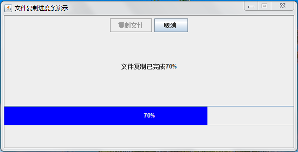 1、利用线程模拟文件复制的进度显示,如下图所示,点击“复制文件”,开始显示进度条,并实时显示复制进度,复制完成后显示“文件复制已完成!”,点击“取消”,取消复制,进度条归零,点击“×”可以退出系统,注意复制按钮和取消按钮在同一时间,只有一个可用。
