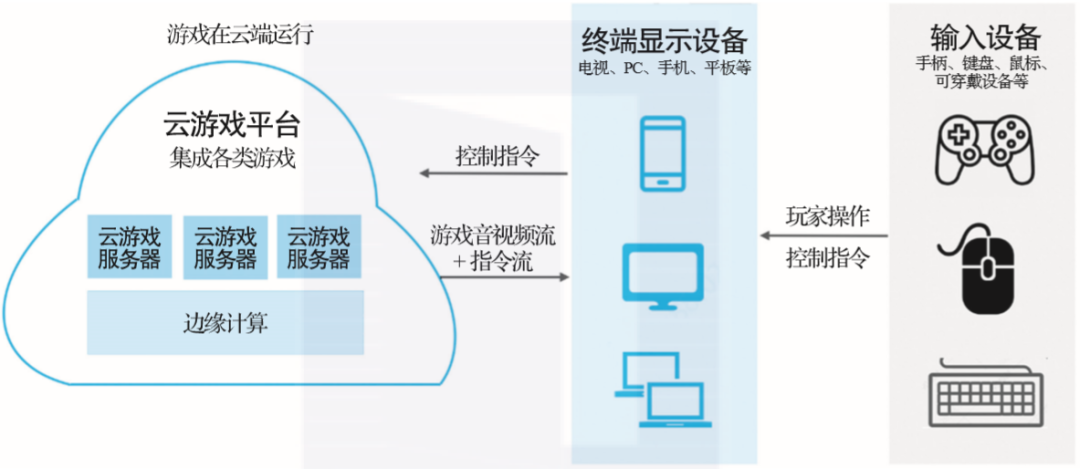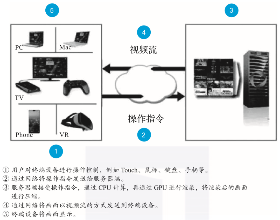 具体可理解为远程超强服务器中拥有众多虚拟电脑,玩家可在其中一台电脑中进行游戏,游戏的画面与声音通过网络传输至终端(PC、移动终端、机顶盒等),玩家可通过输入设备(鼠标、键盘、手柄等)对游戏进行实时操作。