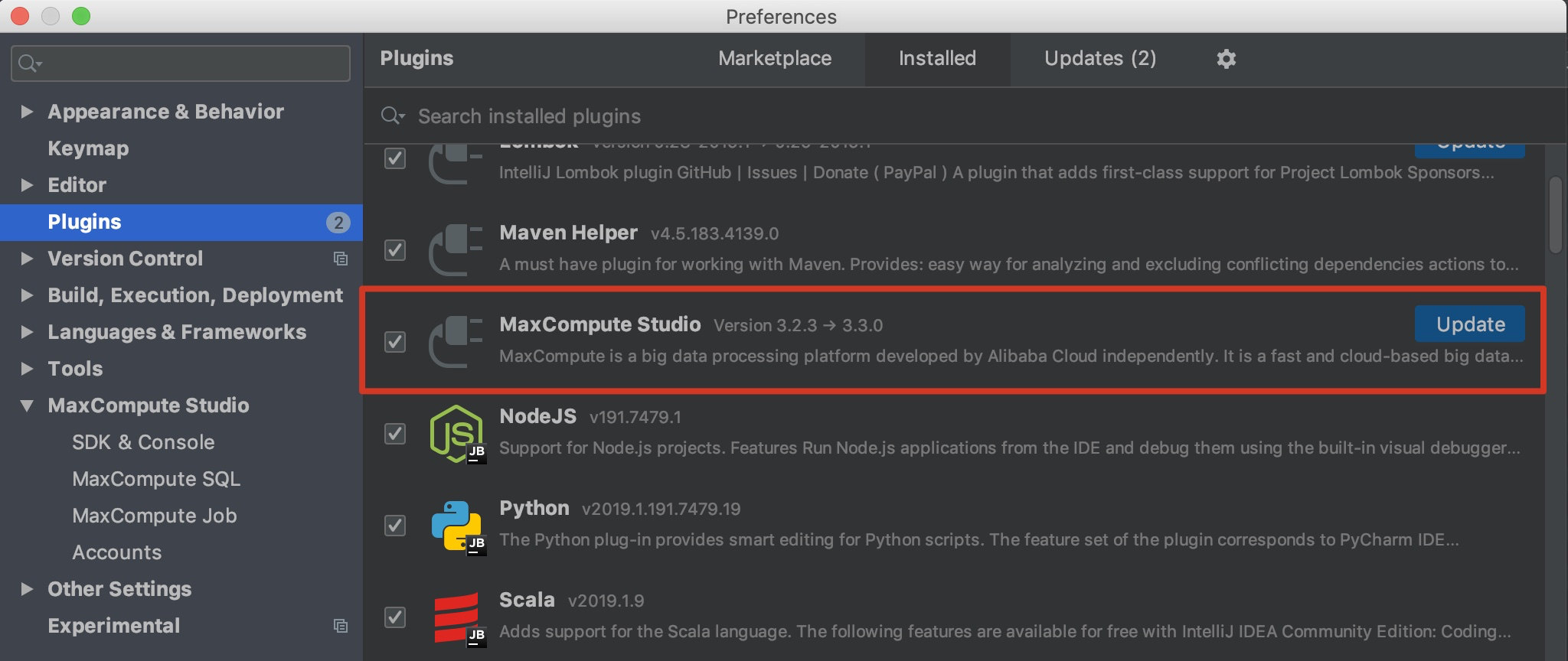 1. 安装IDEA MaxCompute Studio插件。在IDEA的plugins中查找并按照MaxCompute Studio插件,如下图: