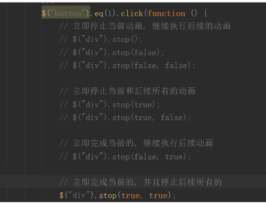 停止当前正在运行的动画。建议在jQuery需要执行动画之前先调用stop方法,再执行动画。
