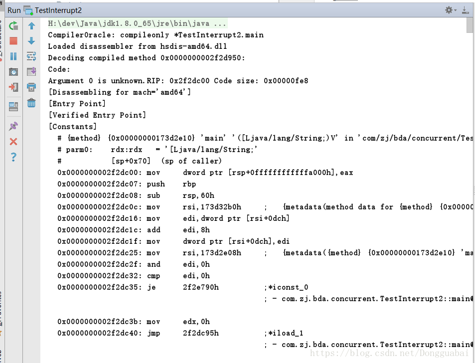 -server -Xcomp -XX:+UnlockDiagnosticVMOptions -XX:+PrintAssembly -XX:CompileCommand=compileonly,*TestInterrupt2.main