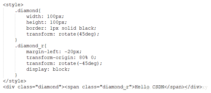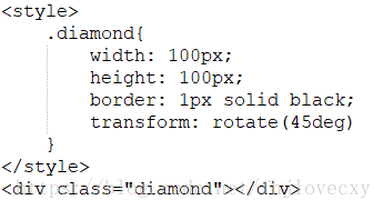 正常div设置宽高并加上边框后显示为一个长方形,而菱形和长方形结构其实相似(正方形也是一种特殊的菱形),如果将div宽高设置为相等值,旋转45°后就可以得到一个最简单的菱形。