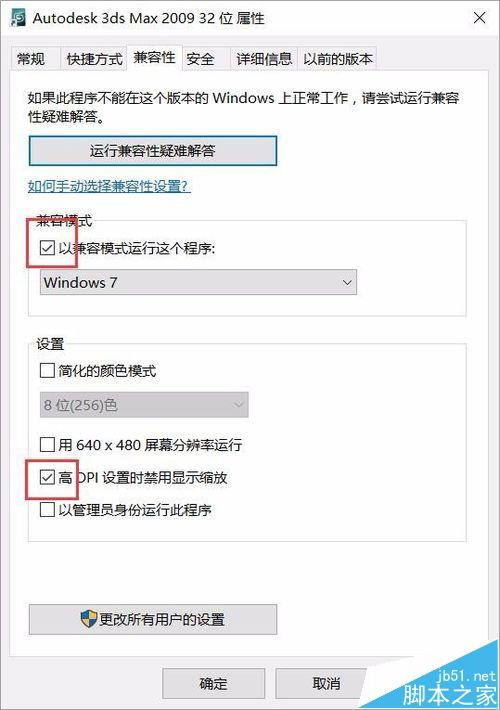 4、勾选兼容运行,勾选高DPI设置时禁用显示缩放,这个是影响卡图的关键,设置好后点击确定,重新打开软件就可以绘图了