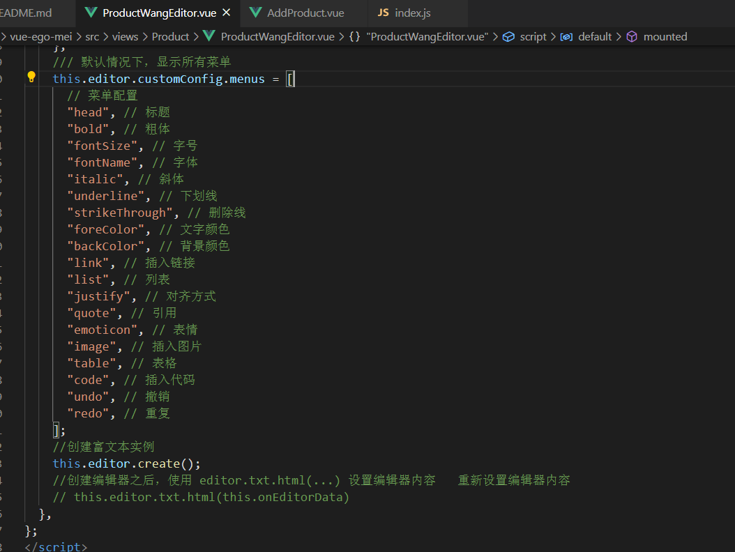 以上就是可耐刺猬最近收集整理的关于在vue中使用wangEditor富文本编辑器wangEditor编辑器 Vue基本配置项的全部内容,更多相关在vue中使用wangEditor富文本编辑器wangEditor编辑器内容请搜索靠谱客的其他文章。