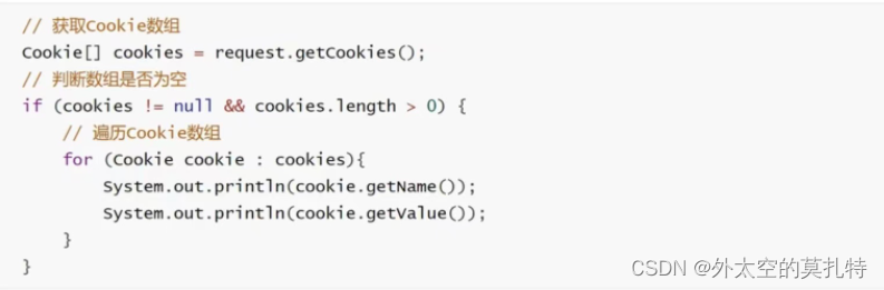 服务器端只提供了一个 getCookies ()的方法用来获取客户端回传的所有 cookie 组成的一个数组,如果需要获取单个 cookie 则需要通过遍历, getName ()获取 Cookie 的名称, getValue ()获取 Cookie 的值。