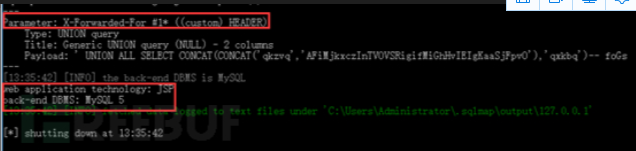 通过sqlmap抛出的信息,可以看到存在sql注入的点是X-Forwarded-For字段,并且爆出了mysql的版本信息和脚本语言的信息。