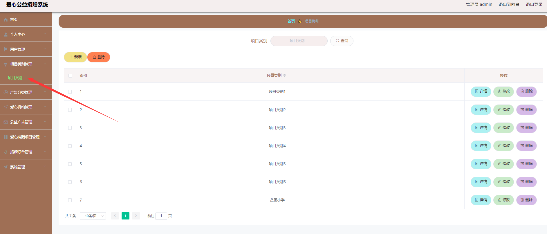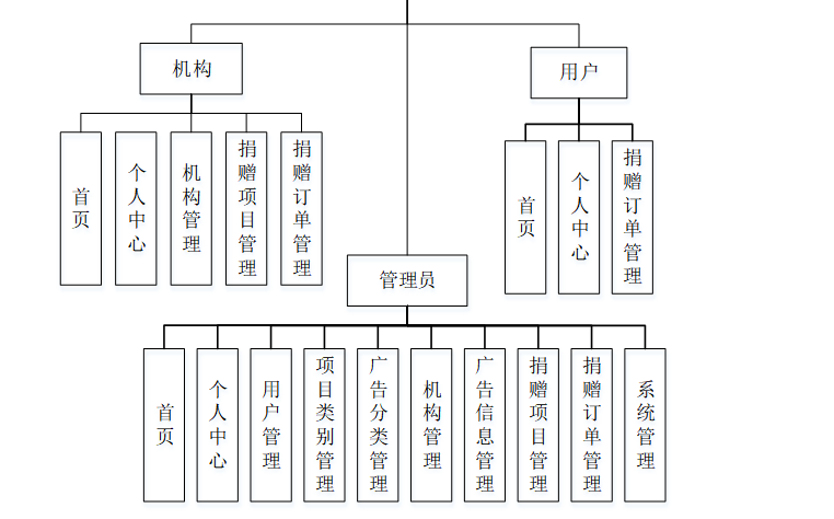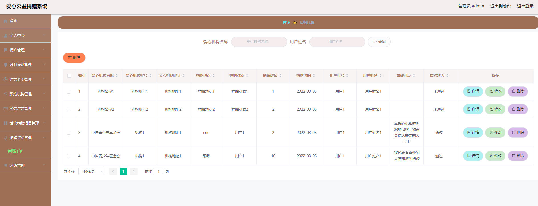 后台超级管理员信息:管理员登录进入系统之后,就可以对所有的信息进行查看,可以查看到首页、个人中心、用户管理、项目类别管理、广告分类管理、机构管理、广告信息管理、捐赠项目管理、捐赠订单管理、系统管理等,并且还可以对其进行相应的操作管理