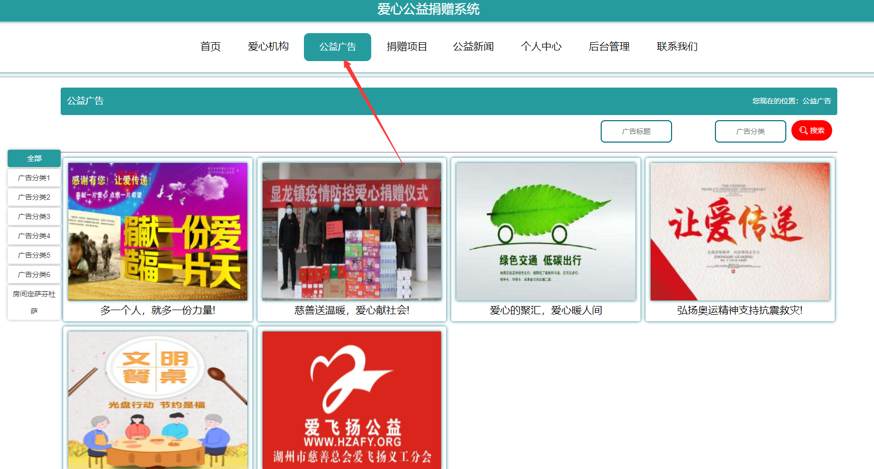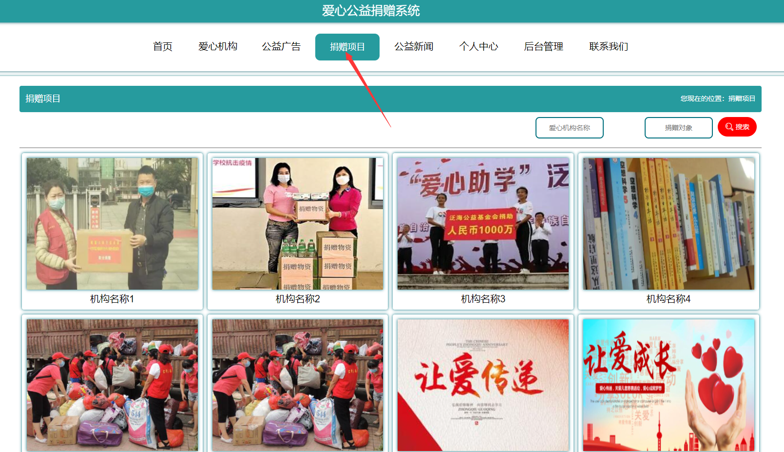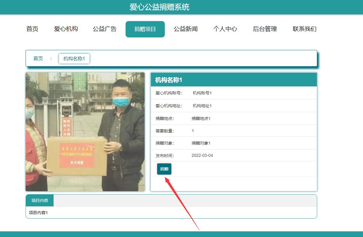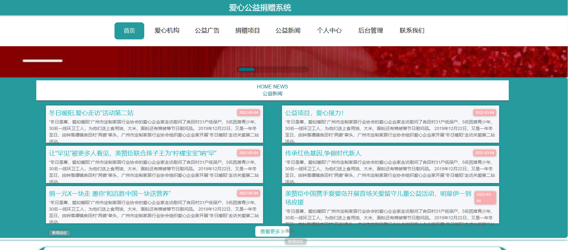 系统首页:在系统的首页可以查看首页、爱心机构、爱心广告信息、爱心捐赠项目、爱心网站新闻、个人中心、后台管理、联系我们等信息进行详细操作