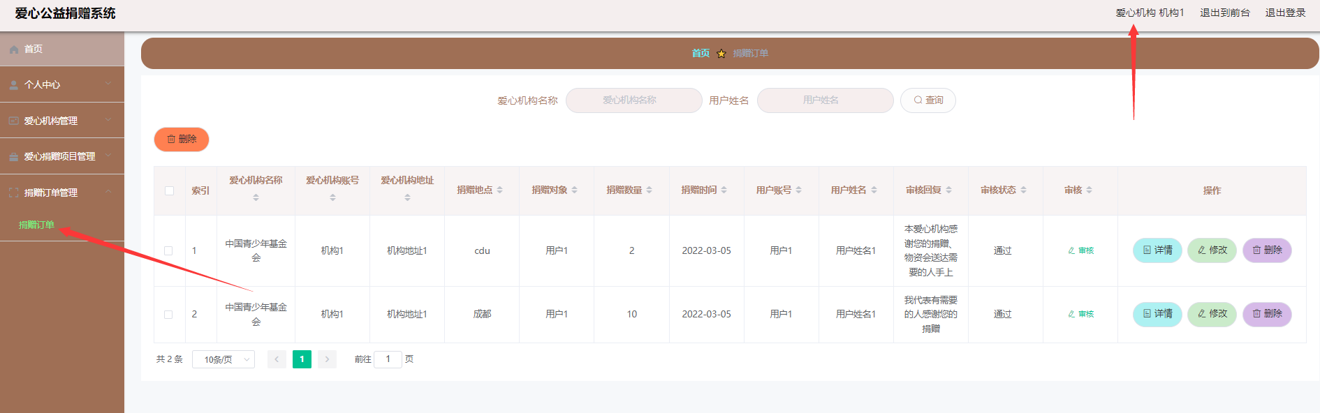 捐赠订单查看:用户捐赠后--机构审核通过后--可查看通过的捐赠或不通过的捐赠信息: