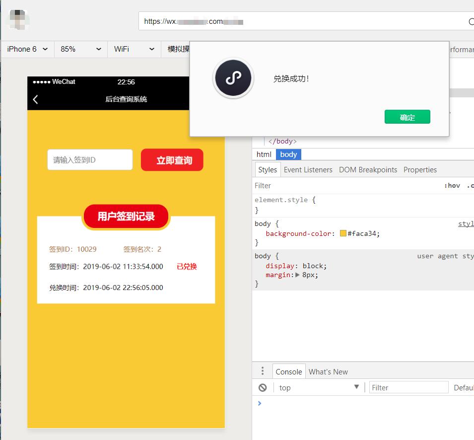 下图为后台兑换的测试页面。输入签到ID即可查询该签到记录。