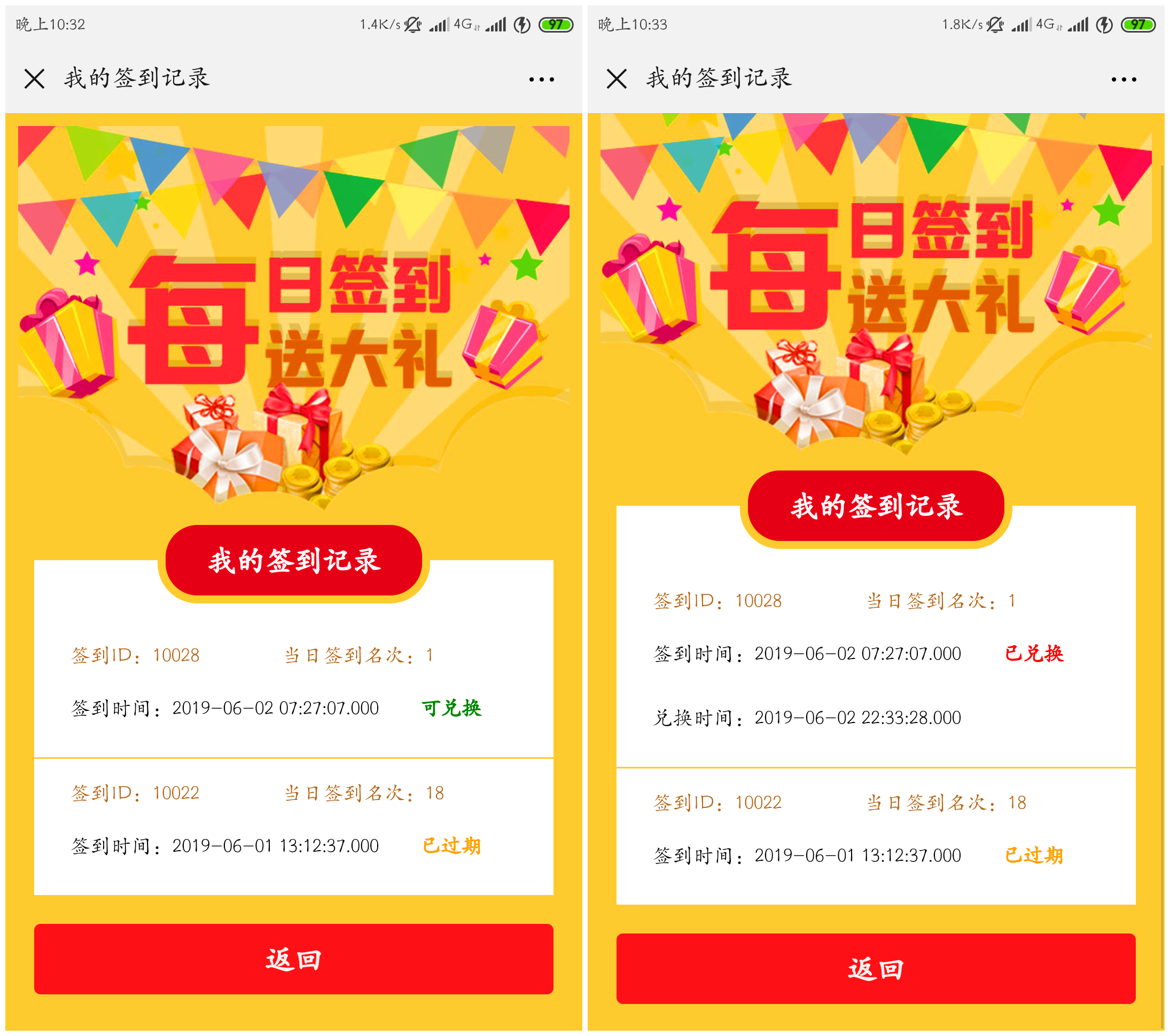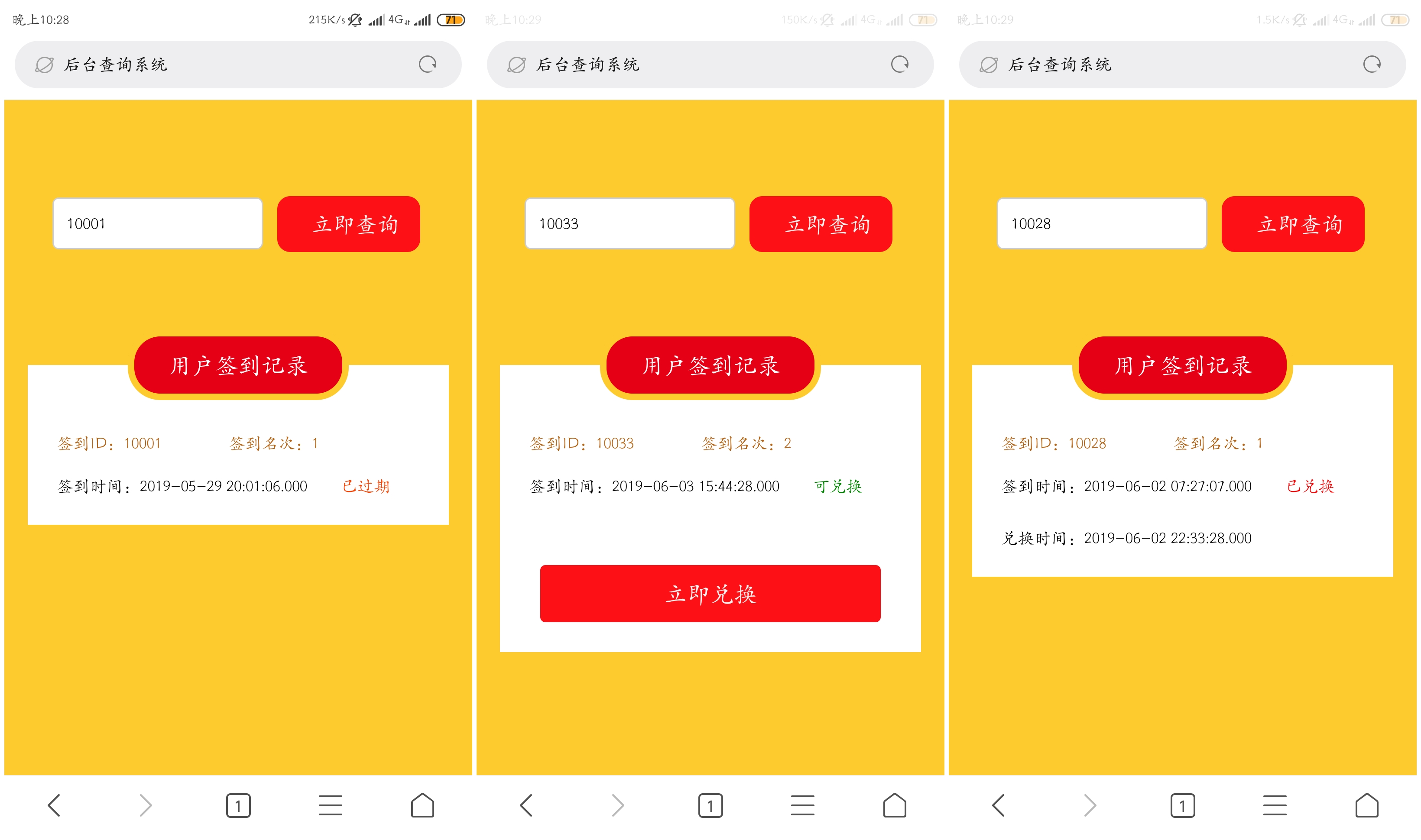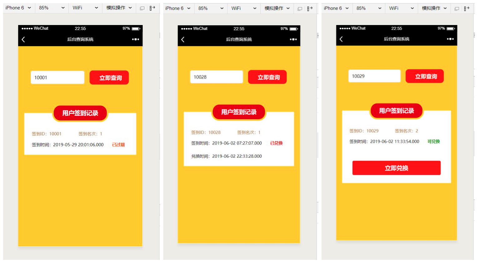 如上图。如果前来兑换的用户的签到记录已过期,则显示如上左图所示。如果用户的签到记录已兑换,则显示如上中图所示。如果用户的签到记录可兑换,则显示如上右图所示。