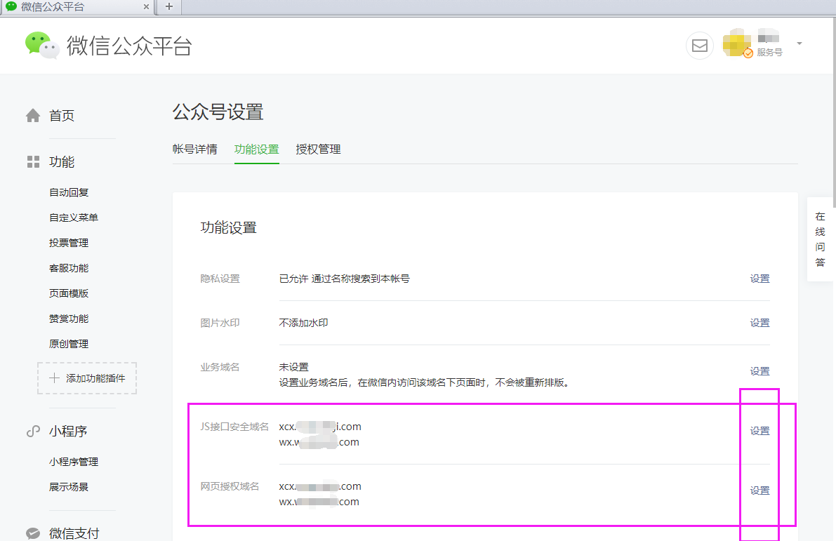所谓对公众号后台进行配置,就是获取公众号的秘钥,以及将域名添加到公众号接口白名单的过程。