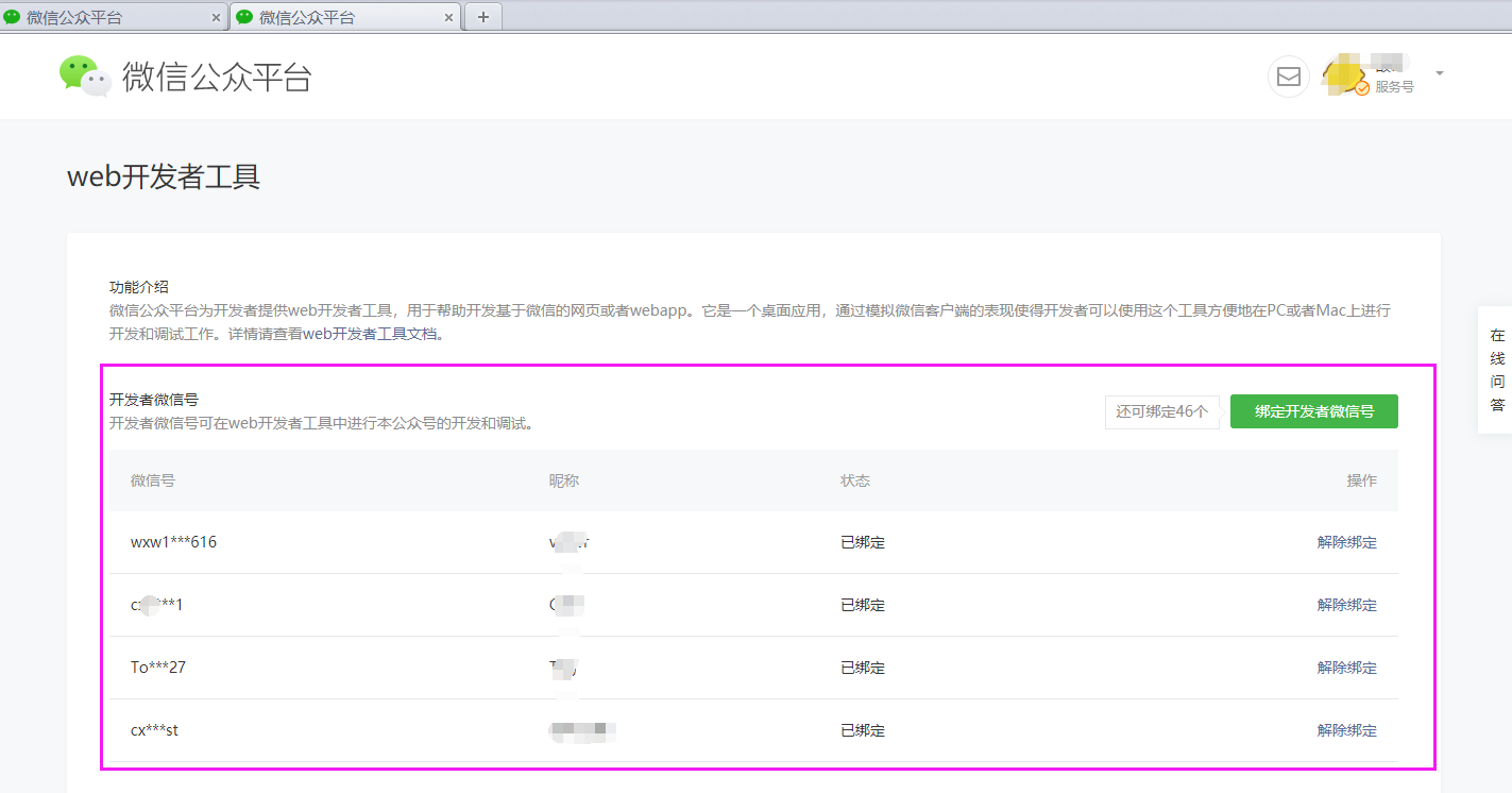 如上图,点击【web开发者工具】,跳转到绑定开发者微信号页面。这里将开发者的微信号进行绑定。