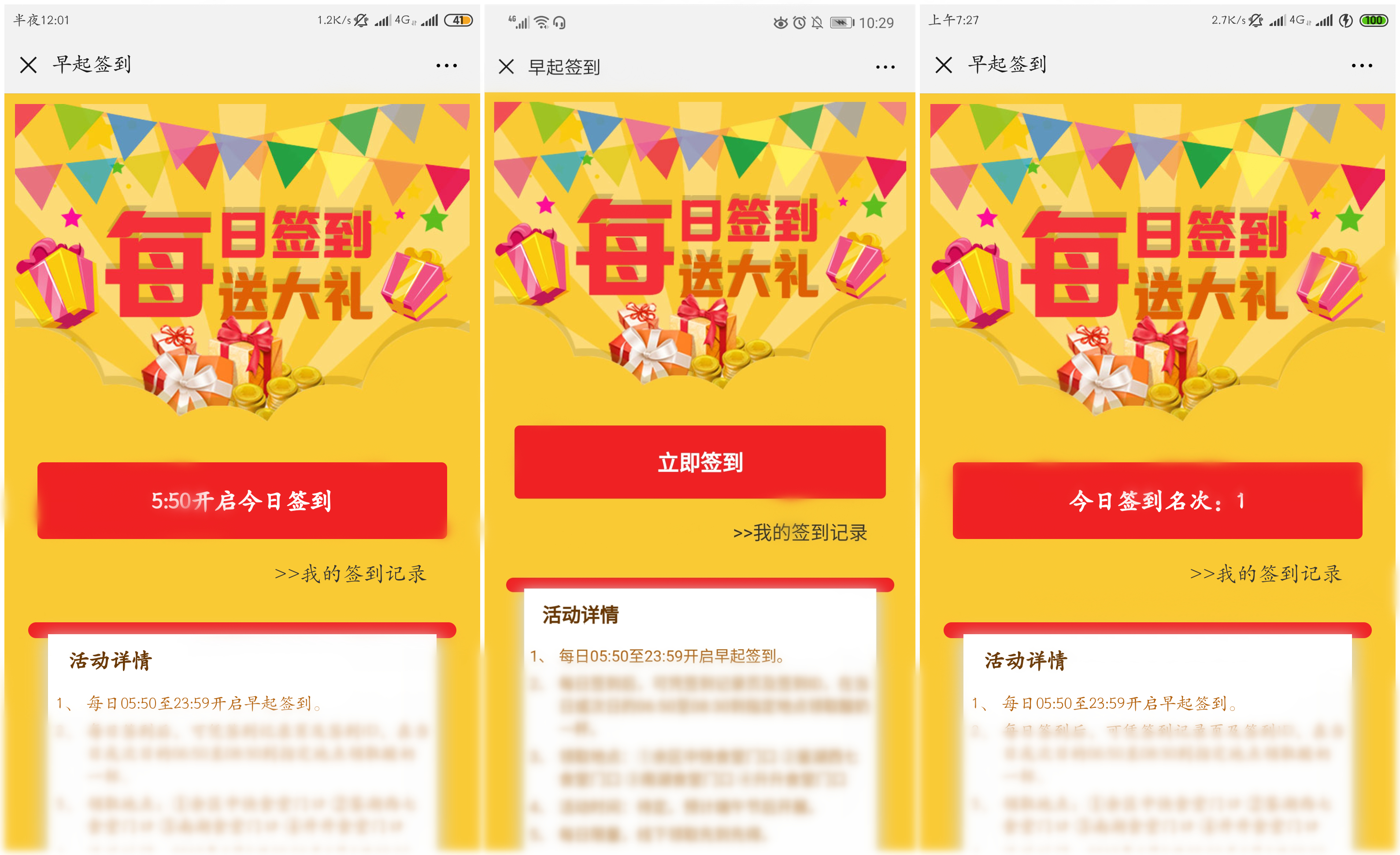 主页面分为三个展示页面。未到签到时间(0:00到05:50期间)显示图如上左图所示。到签到时间时,按钮状态可点击,如上中图。签到完成后,将显示该用户在本公众号的当日签到名次。