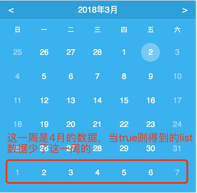 getDayList(bool)方法,传入一个bool值,为true,则去掉不包含当月的一个星期的数据: