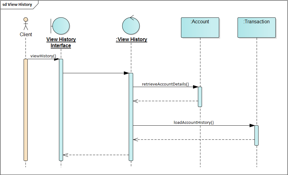 此图说明了在交互中满足视图历史用例所需的对象。对象之间的消息流为用户提供了事务历史信息。描述图书管理系统如何查阅历史的操作系列,反应了客户端与各对象间消息传递关系。