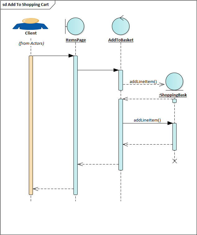 描述了一个图书管理系统如何从订单发起后的所有交互概要图,每个子图上面的ref表示引用了一个更详细的图,比如Add to Shopping Basket 放入购物篮的具体动作: