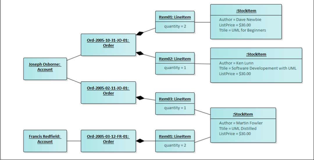 对象图/Object Diagram: 描述系统类在某个时刻的具体实例化情况,类似系统某时刻对象角度的快照