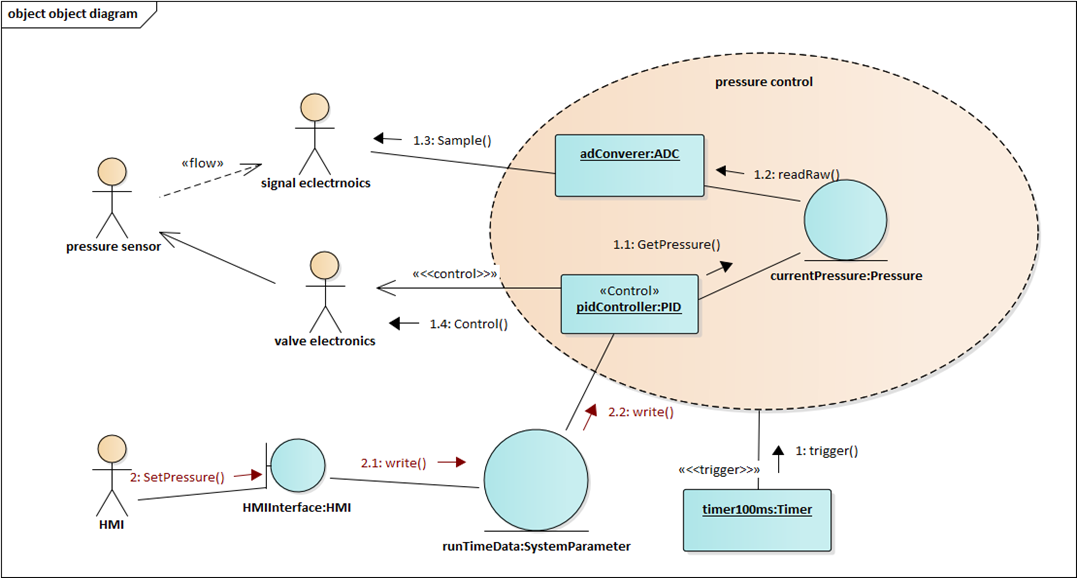 这是一个嵌入式系统的UML建模,该图描述一个压力控制系统两个主要用例的实现: