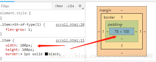 注意:子级元素设置的宽是100px,但是盒模型的宽却是78px,要注意的是,width值的存在意义重大,尤其是计算布局时。
