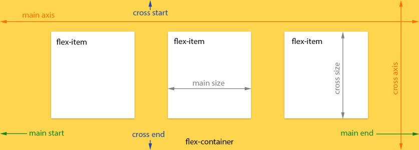 flex容器默认存在两根轴水平的主轴(main axis)和垂直的交叉轴(cross axis)。主轴的开始位置(与边框的交叉点)叫做main start,结束位置叫做main end;交叉轴的开始位置叫做cross start,结束位置叫做cross end。项目默认沿主轴排列。单个项目占据的主轴空间叫做main size,占据的交叉轴空间叫做cross size。