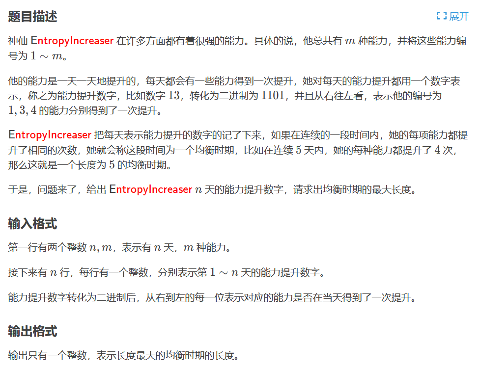 有n天,m种能力,每天给你一个数x,每天提升的能力用该数的二进制表示,1为提升,反之则不,问你最长的连续几天提升的每种能力相同的天数。