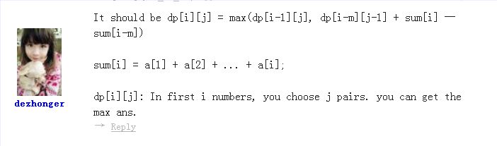 那么对于第 i 个数来说,有不选和选择的两种情况。如果不选第 i 这个数 ,即dp[i-1][j],表示前 i 个数,选择 j pairs 获得的最大和 = 前i-1个数中选择 j pairs 可以获得的最大和;如果选第 i 个数,状态就转移到 dp[i-m][j-1] + sum[i] - sum[i-m],这个 sum[i]- sum[i-m] 会成为新的一个pair,前面那个第 i-m 个数就不要选。