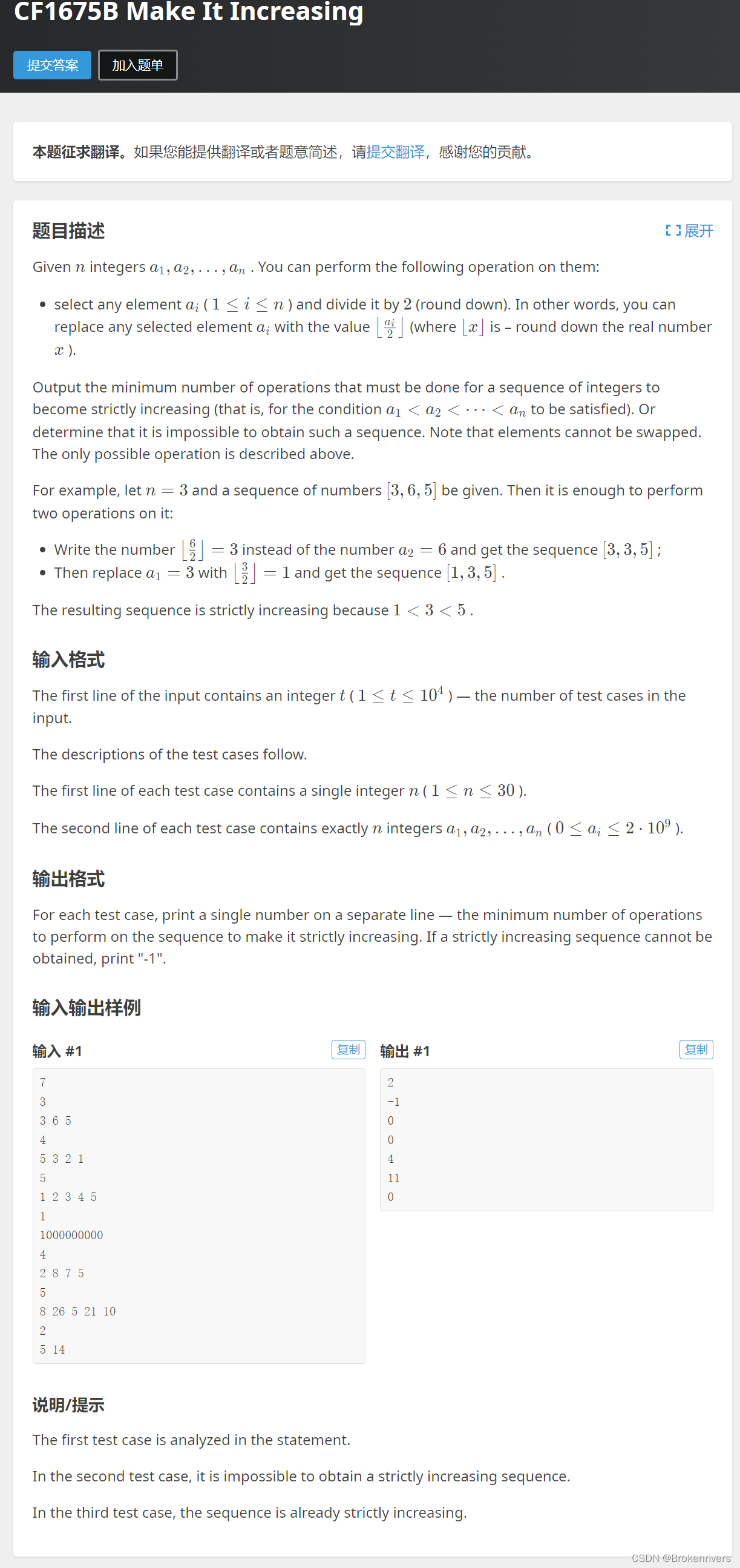 题目是说给定一个序列,每次你能对其中一个让其中一个元素变为原来的一半(向下取整 ),问能否使这个序列严格递增。如果能则输出最小步骤数。