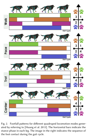 四足动物动画是计算机动画中一个未解决的关键问题。它不仅同计算机游戏和电影的实现有关,也是机器人学中一个具有挑战性的主题。当动画化四足动物时,动画制作者必须通过针对性的训练来设计出不同的复杂动作。由于四足运动的多模态性,这种复杂性是与生俱来的。比如说,躯干和四肢在不同的动作(走,踱,快跑,慢跑,飞奔)中都会展现出不同的运动和相位样式。如下图Fig2