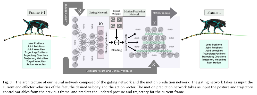 我们的系统是一个时间系列模型,可以在给定x---前一帧的角色状态和控制信号的情况下预测y---当前帧的角色的状态。为了在四足动物这一角色上实现这个目标,我们提出了一个新的神经网络结构MANN,模态适应性神经网络(第6节)。当前帧的动作由动作预测网络计算,该网络的权重由门网络进行动态计算(6.1,6.2)。这个门网络接收动作的特征