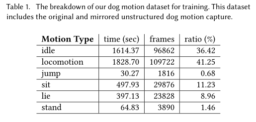 狗动作分类。这些动作最初被分为坐,站,停,躺,跳等所以用户可以在运行时根据这些标签来控制角色。这个过程是手动进行的,虽然自动分类也不困难。运动数据的分解率如下Table1