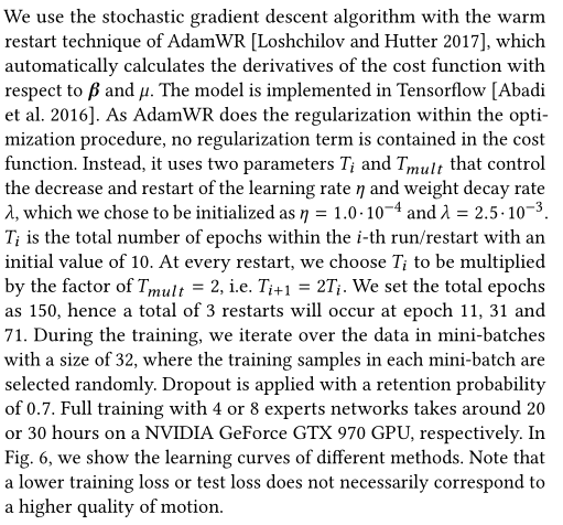 在这篇论文中,我们提出了一个新的网络结构MANN,它可以从大量的无组织四足动物动作捕获数据中学习动作控制。这个系统由动作预测网络和门网络组成。在每一帧画面中,动作预测网络负责计算角色在给定上一帧状态和用户提供的控制信号情况下的当前帧的状态。而门网络,通过选择和混合所谓的针对每一个特定动作的专家权重,动态地更新动作预测网络的权重。这个框架使得系统变得很灵活,系统可以在非周期性动作和周期性的无标记步态类型动作中学习连续特征。这个框架可以使用户从单调乏味且苦难的相位标记(phase labeling)阶段(无序的四足动物动作捕获数据需要按照时间线排列)中释放出来。特别的是,我们的模型不需要对不同的(对人类来说难以区分的)步态进行单一标记分类,因此可以避免数据处理过程中的错误标记。