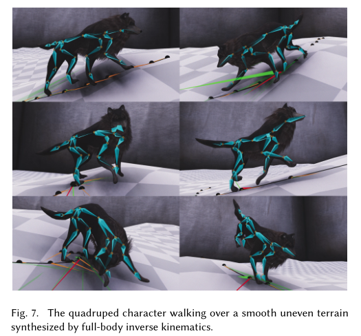 最终,我们设置了一个角色需要在不平稳地形移动的环境。如下Fig7。我们没有像2017年那样训练角色走过不同的地形,而是对角色简单地应用了CCD逆向动力学。爪子的位置和效应器的位置被后处理,这样它们除了产生的运动之外还有偏移地形的高度,脊关节也相对周围高度同时更新。这是为了避免在上下行走时四肢出界,从而产生更加自然的动作。