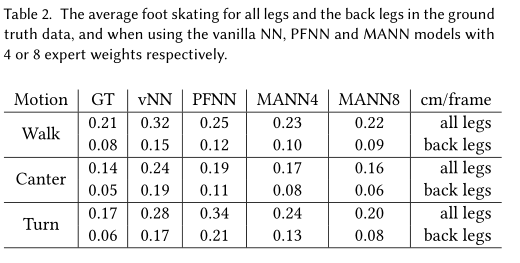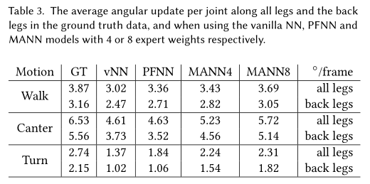 腿的僵硬程度:在PFNN中,滑步是由后退的僵硬导致的,由于前腿运动后计算出来的相位下后退运动的融合造成。为了定量评估这种将硬度,我们计算平均每次所有腿和后腿的关节角度,如下Table3。可以看到,与MANN相比,vanilla和PFNN腿的运动要小得多,尤其是后腿。