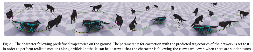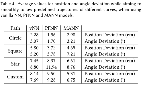 由角色产生的轨迹如Fig8所示。然后,考虑到它们的根变换,我们测量了期望轨迹与角色的实际轨迹之间的差异。(见Table4)。 可以观察到角色很好地跟随路径并且平均距离很低。