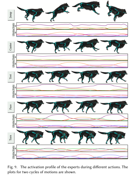 网络到底学了什么?为了检验这种情况,我们绘制了混合系数ω的轮廓---当角色在Fig9中执行不同类型的动作和运动模式时,K = 4和8的专家权重。可以观察到权重值是相同的循环低速运动(参见Fig9,第二个底部,底部,上部行),使得门控网络的功能与PFNN中的相位功能相同。专家权重对应紫线的时期随着运动速度的增加,它变得活跃,变得更长和恒定,而其他的在这种情况下往往变得不活跃。这意味着这些专家权重训练负责快速运动,跳跃运动,而其他可能负责合成比较慢的运动。特别是,通过选择性地禁用混合系数的单个维度,我们观察到角色不再能够执行某些动作,例如单一类型的运动模式,转动或跳跃。Table5列出了我们对具有8个训练混合系数的学习网络的观察结果。虽然它们中的大多数明显有助于整体运动质量,但有些对特定的动作或模式负有全部责任。特别是对于向左或向右转动,可以观察到转向相反方向仍然大部分或甚至完全不受影响。