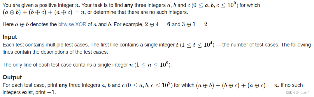 然后就想到可以是两个数相同,这样三个数的和就可以转化为两个数的和,而对于偶数,直接用n/2和0异或即可;对于奇数,样例中的1不满足,然后我就直接猜测奇数不可以满足条件,事实证明这个是可以证明的:假设二进制最后一位有k个1和3-k个0,那n的二进制最后一位的奇偶性与k*(3-k)相同,那么n的二进制最后一位应该恒为0。
