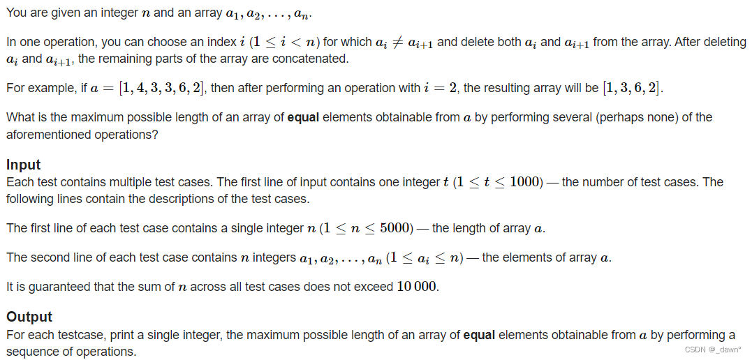 给出一个数组,若相邻两个数不同,那可以删去这两个数。最终操作完成后数组中剩余的数都相等,问最多可以保留几个数。