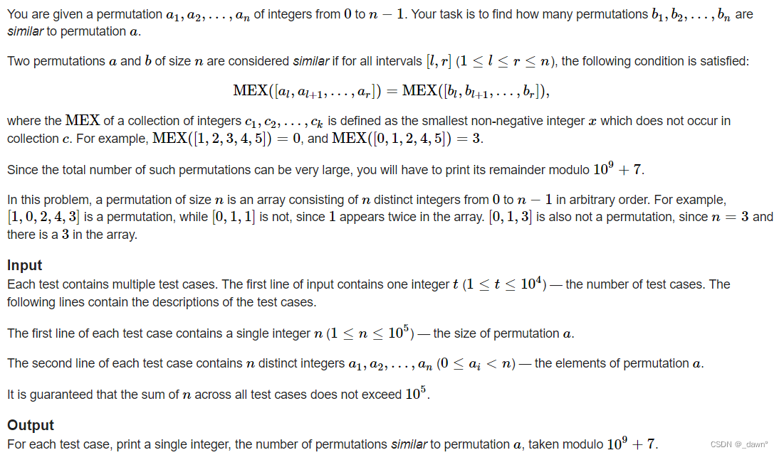 给出一个permutation,不过是从0~n-1,问有多少种重新排列这些数的方法,使得重新排序后的数组对于每个区间的MEX值相等。