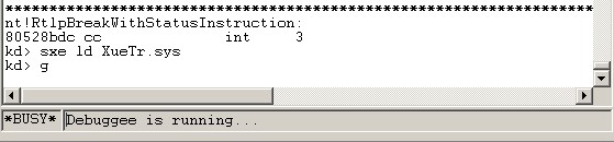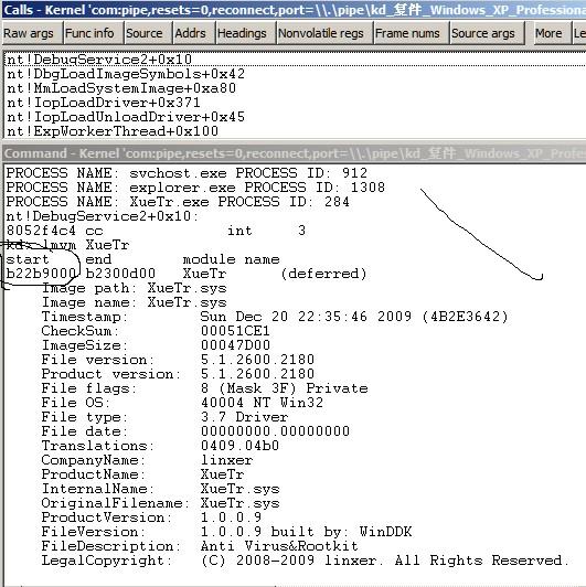 3.查看XueTr.sys的相关信息,记录下起始地址,利用bp b22b9000+poi(poi(b22b9000+3c)+b22b9000+28)下断,断下后,即是驱动的入口了。