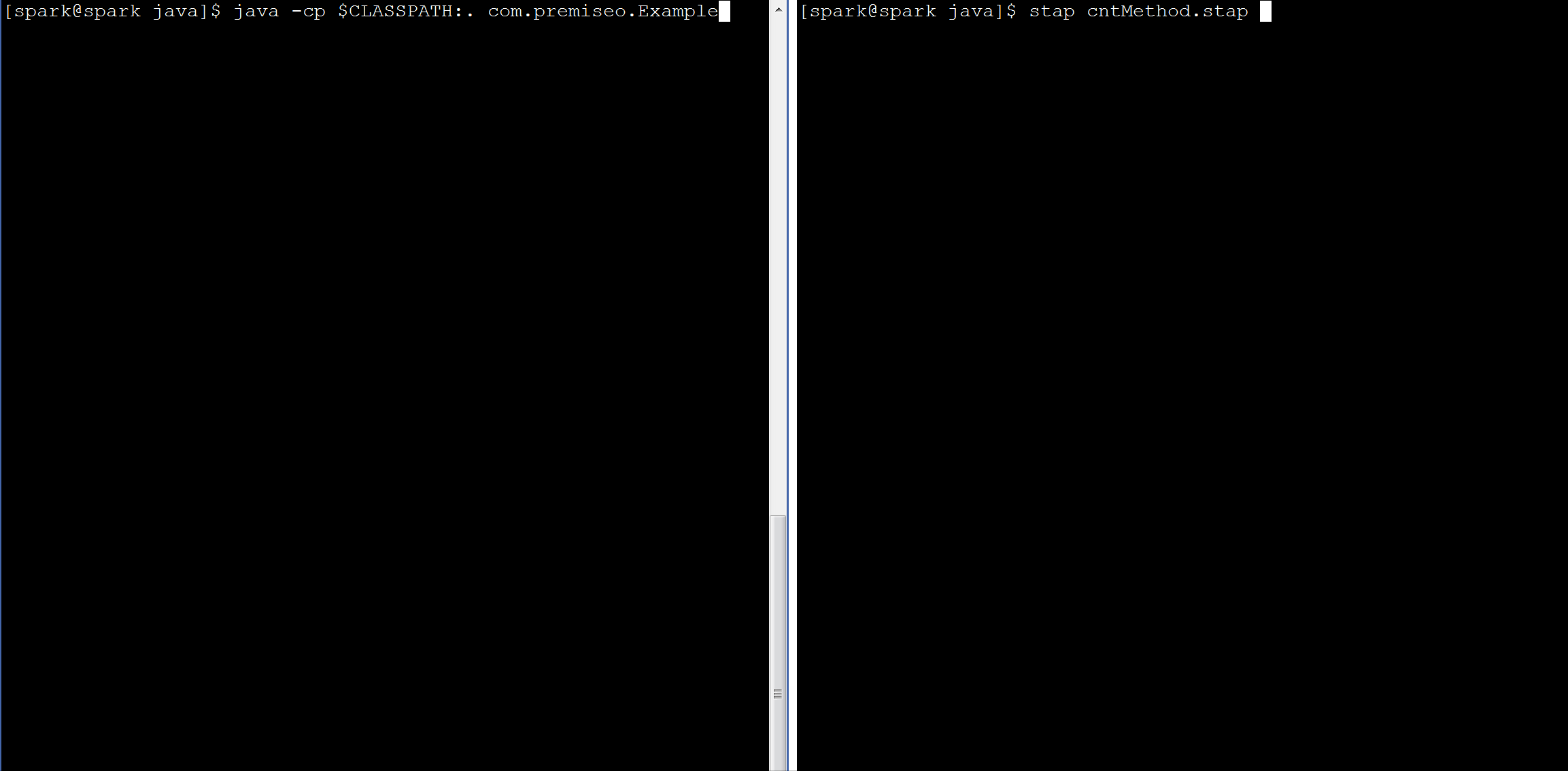 [spark@spark java]$ javac -cp $CLASSPATH:. com/premiseo/Example.java [spark@spark java]$ java -cp $CLASSPATH:. com.premiseo.Example PID = 9928 Press any key when ready ... Waiting 1000ms... Tick Waiting 1000ms... Tick Waiting 1000ms... Tick Waiting 1000ms... Tick Waiting 1000ms... Tick Waiting 1000ms... Tick Waiting 1000ms... Tick Waiting 1000ms... Tick Waiting 1000ms... Tick Waiting 1000ms... Tick