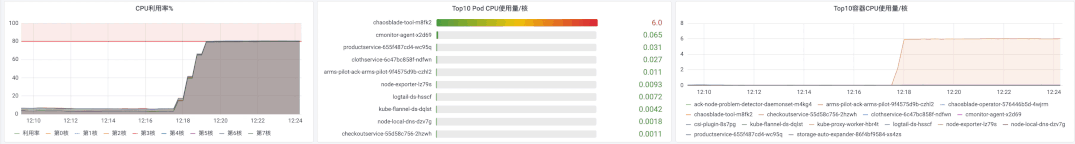 2、查看对应的 CPU 的三元组:使用率、TopN、时序图,首先每个核的使用率都很高,进而导致整体 CPU 使用高;接下来我们自然要知道谁在疯狂地使用 CPU,从 TopN 列表来看有个 Pod 一枝独秀地占用 CPU;最后我们得确认下 CPU 飙高是什么时候开始的。
