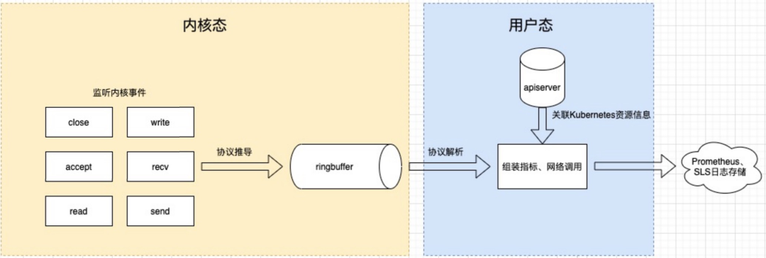 eBPF 相当于在内核中构建了一个执行引擎,通过内核调用将这段程序 attach 到某个内核事件上,实现监听内核事件。有了事件我们就能进一步做协议推导,筛选出感兴趣的协议,对事件进一步处理后放到 ringbuffer 或者 eBPF 自带的数据结构 Map 中,供用户态进程读取。用户态进程读取这些数据后,进一步关联 Kubernetes 元数据后推送到存储端。这是整体处理过程。