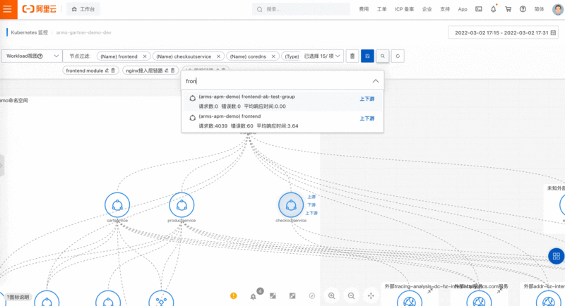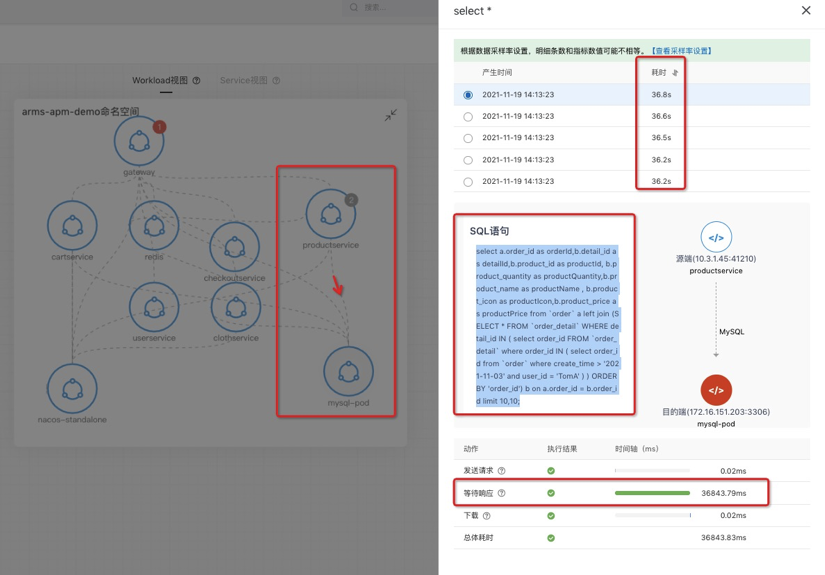 接下来我们看一个典型的案例:下游服务在发布过程中灰度了一个 Pod,该 Pod 因代码原因响应非常慢,导致上游都超时了。之所以能做到 Pod 级别的可观测,是因为我们用 ebpf 的技术来采集 Pod 的流量、黄金指标,因此可以通过拓扑、大盘的方式方便地查看 Pod 与 Pod、Pod 与服务、Pod 与外部的流量。