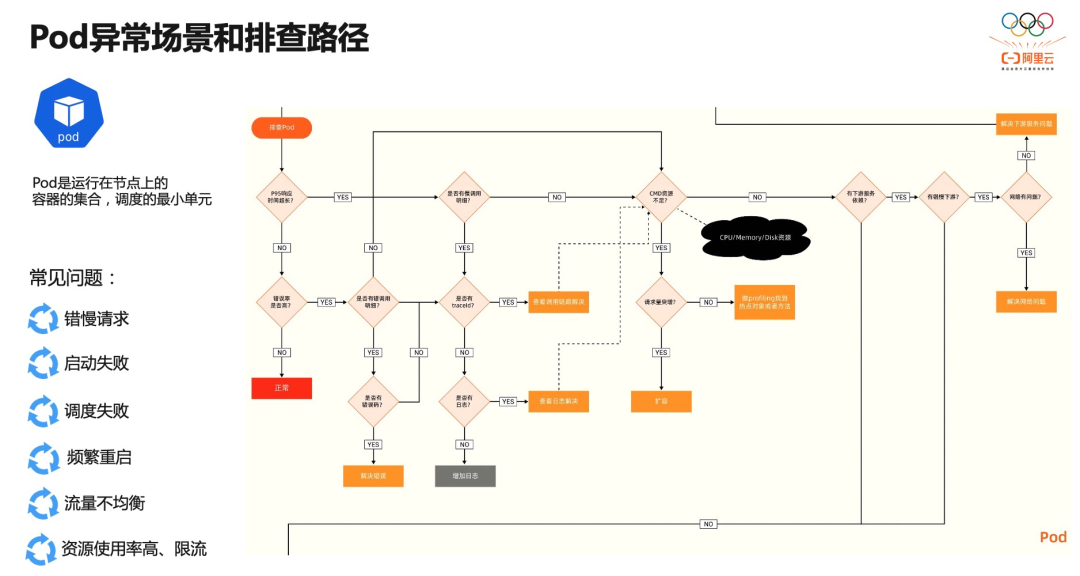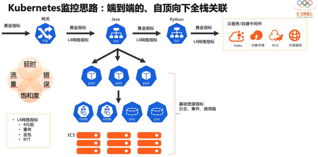 - 再往下一层是提供真正工作负载能力的 Pod。Pod 重点关注是否有错慢请求,是否健康,资源是否充裕,下游依赖是否健康等