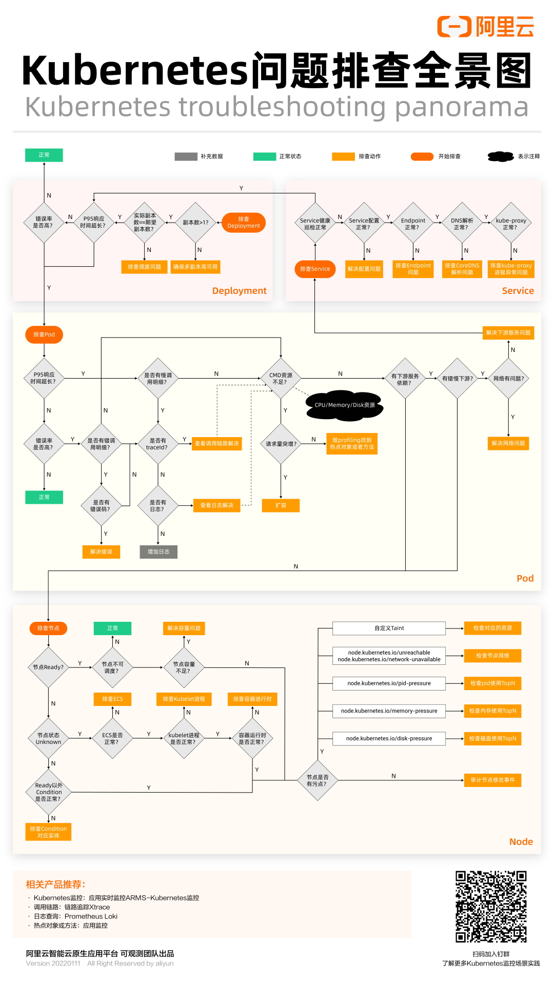 有了上述产品能力,基于阿里巴巴在容器、Kubernetes 方面有着丰富且极具深度的实践,我们将这些宝贵生产实践归纳、转化成产品能力,以帮助用户更有效、更快捷地定位生产环境问题。使用这个排查全景图可以通过以下方法: