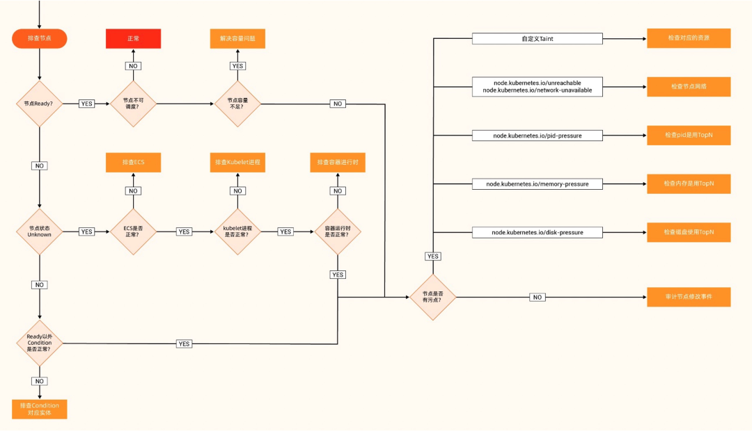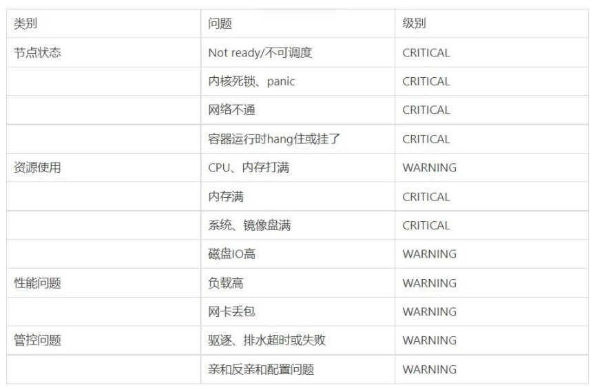 Kubernetes 做了大量工作,尽可能确保提供给工作负载和服务的节点是正常的,节点控制器 7x24 小时地检查节点的状态,发现影响节点正常运行的问题后,将节点置为 NotReady 或不可调度,通过 kubelet 把业务 Pod 从问题节点中驱逐出去。这是 Kubernetes 的第一道防线,第二道防线是云厂商针对节点高频异常场景设计的节点自愈组件,如阿里云的 node repairer:发现问题节点后,执行排水驱逐、置换机器,从而做到自动化地保障业务正常运行。即便如此,节点在长期使用过程中不可避免地会产生各种奇奇怪怪的问题,定位起来比较费时耗力。常见问题分类和级别: